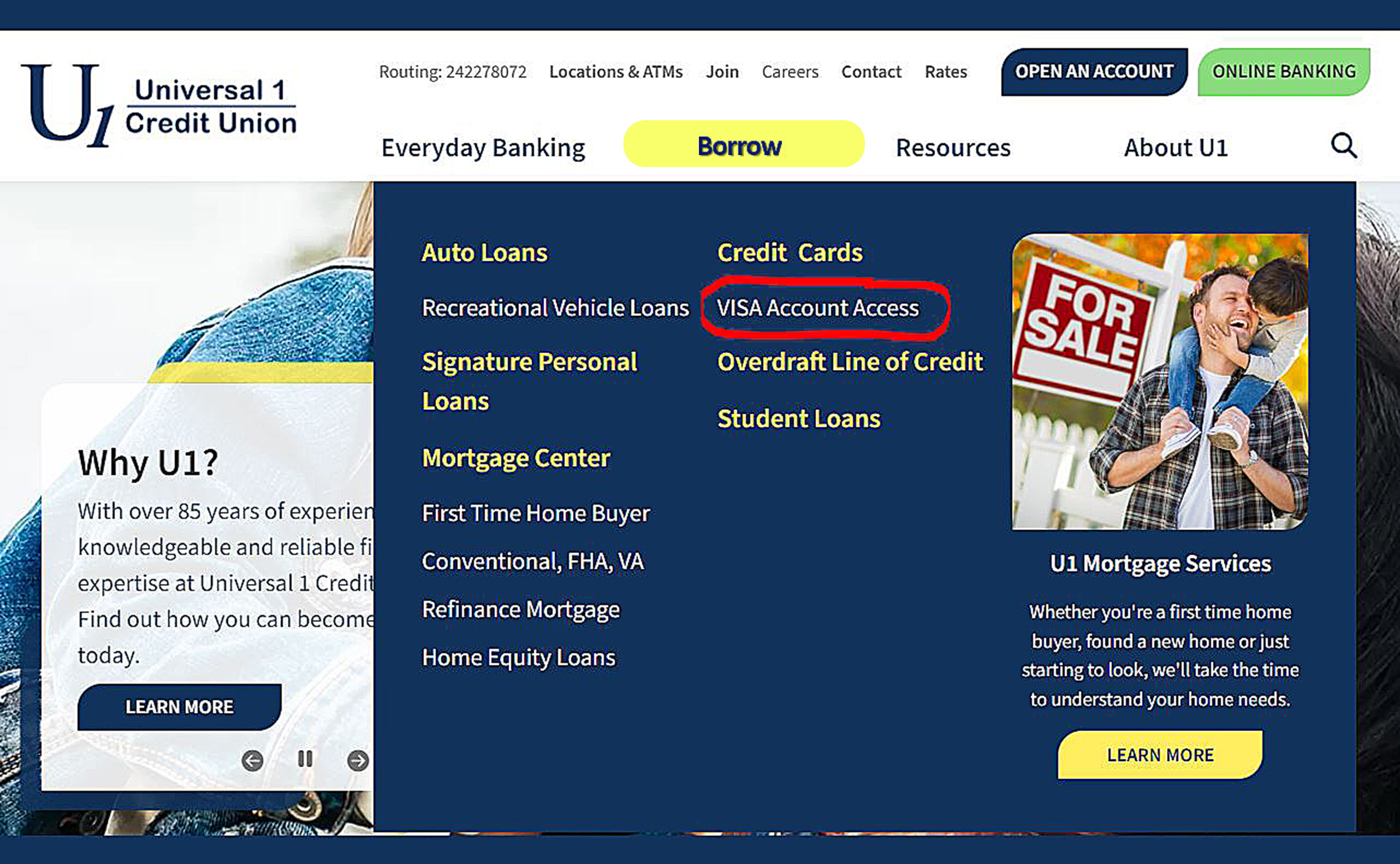 - You can locate the login page for your VISA account under the Borrow menu. Click “VISA Account Access” under the Credit Cards menu.