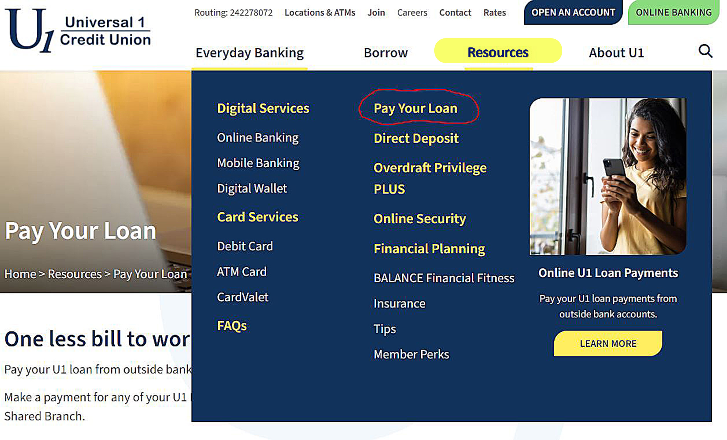 - If you want to make a payment to your U1 loan from an outside bank account, click the Resources menu. Click Pay Your Loan to view the different options on paying your loan.